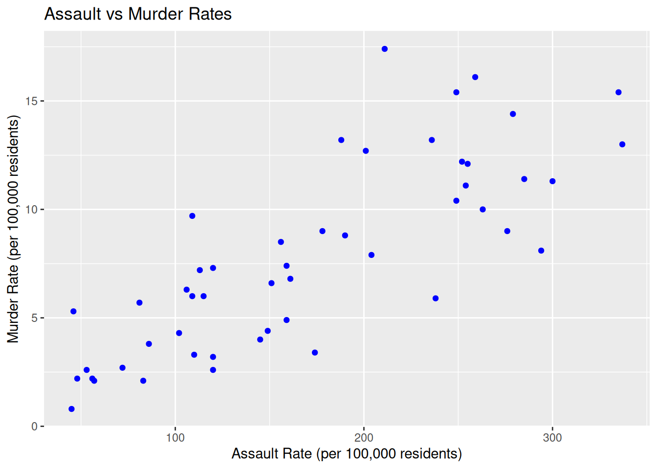 ggplot(USArrests, aes(x = Assault, y = Murder)) +