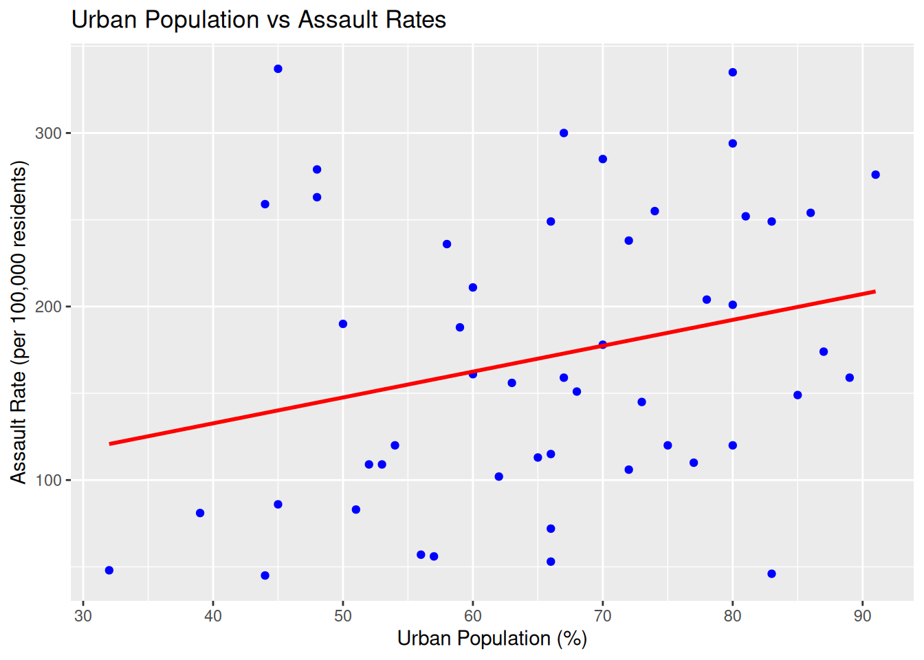 ggplot(USArrests, aes(x = UrbanPop, y = Assault)) +