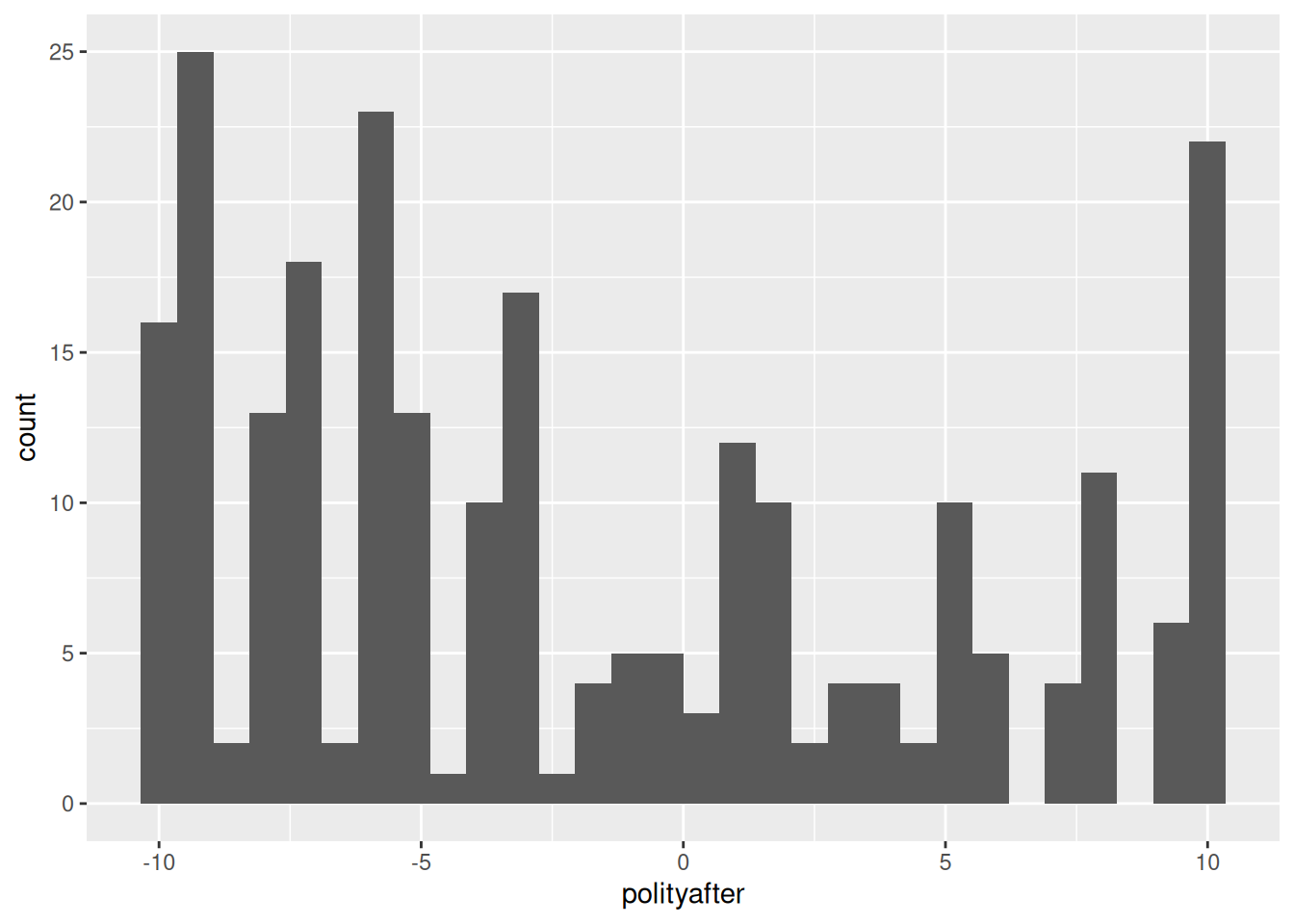 The outcome variable should be polityafter since that is the variable that records the level of democracy observed in our country cases after assassination attempts have taken place. Based on the histogram of this variable below, we can see that there is a good spread of levels of democracy in our sample.